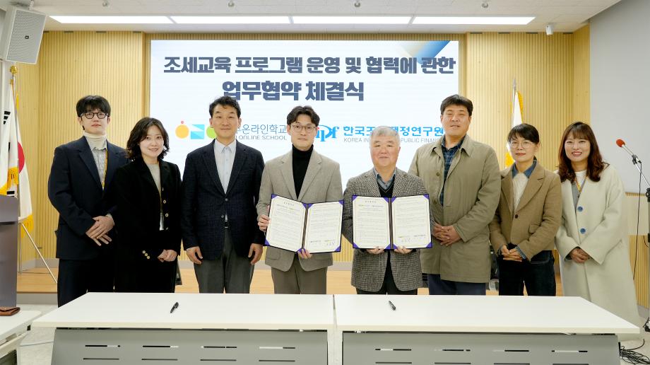 □ 한국조세재정연구원(원장 이영)은 2026년 2월 24일(화) 제주온라인학교(교장 양용혁)와『조세교육 프로그램 운영 및 협력에 관한 업무협약(MOU)』을 체결함.